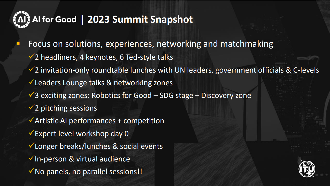 2023 AI for Good全球峰會(huì)將于7月6日至7日在瑞士日內(nèi)瓦召開(kāi),會(huì)議由聯(lián)合國(guó)信息和通信技術(shù)專門機(jī)構(gòu)國(guó)際電信聯(lián)盟(ITU)與40個(gè)聯(lián)合國(guó)系統(tǒng)機(jī)構(gòu)合作組織、瑞士政府共同舉辦,是聯(lián)合國(guó)開(kāi)展人工智能對(duì)話的重要平臺(tái)。
