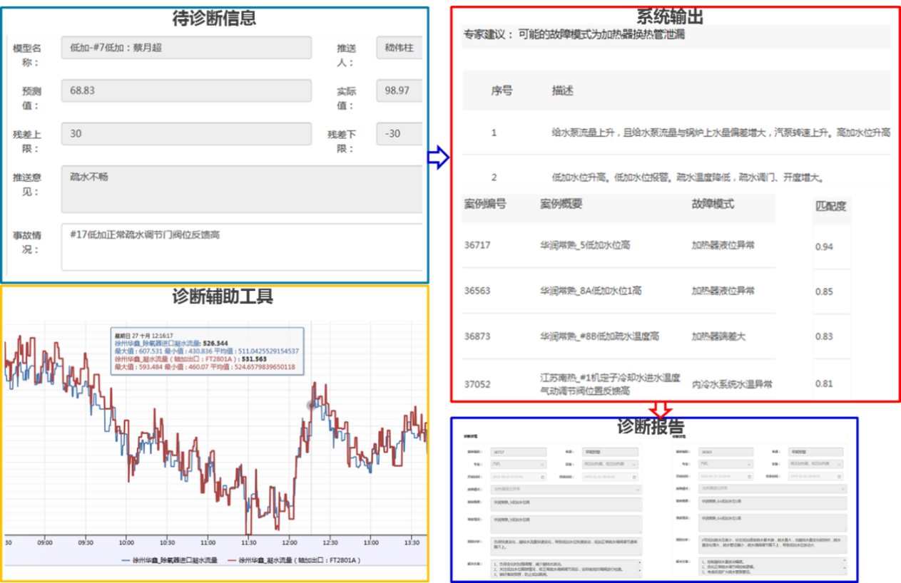 南京化學工業(yè)園熱電有限公司2018年10月29日從預警系統(tǒng)推送至診斷系統(tǒng)一條告警信息:“前置泵電機軸承溫度高”,診斷系統(tǒng)根據(jù)告警信息推薦的案例中詳細介紹了前置泵電機軸承溫度高的主要原因與處理方法,用戶參考推薦案例,判斷軸承溫度高的原因為潤滑油過量,通過調整自動加油裝置的加油頻率解決了該問題,而這一案例也作為新的案例進入了知識庫,當該問題再次發(fā)生時,診斷系統(tǒng)會立即推送該案例給用戶,起到知識傳承的作用,診斷過程參見圖16。