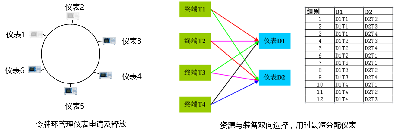 由于不同產(chǎn)線的工位數(shù)量不同,測試項目也有不同,需要結(jié)合儀表云的能力做各工序的編排,采用人工事前處理速率較慢,采用固定編排也不適應(yīng)產(chǎn)線柔性工作工作。因此結(jié)合智能算法,通過令牌環(huán)動態(tài)分配儀表的邏輯功能、按預測總用時最短的組合編排測試過程,從而實現(xiàn)最優(yōu)稼動率,如圖4所示