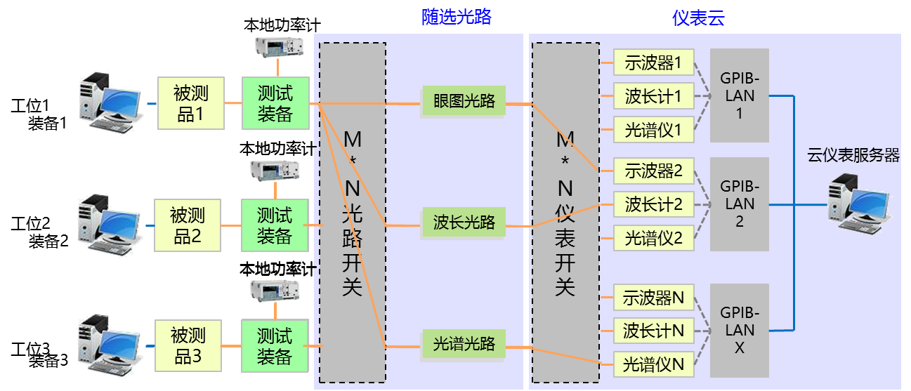 項目總體在于將儀表資源池成云,按需調(diào)用,改善之前被測品光指標測試要經(jīng)過多個工位才能完成。周轉(zhuǎn)次數(shù)多,操作復雜,重復動作多的問題。在邏輯功能上可以分為儀表云本體及配套的隨選光路兩部分。