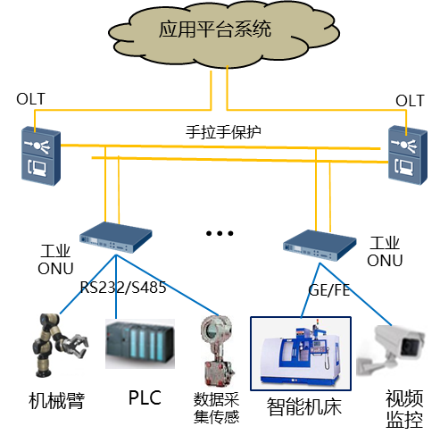 通過在生產(chǎn)線部署工業(yè)PON網(wǎng)絡(luò)(包括OLT、ODN以及ONU等),實現(xiàn)生產(chǎn)現(xiàn)場設(shè)備和監(jiān)控中心/云端互聯(lián)。組網(wǎng)架構(gòu)如下: