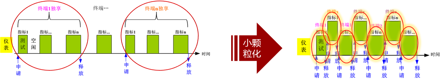 一項工作,這導致在測試多項指標時出現(xiàn)等待,延長了整體測試時間。為此將儀表通過虛擬化,分解為多項邏輯功能。通過對多臺儀表邏輯功能的小顆粒化調(diào)度,可以實現(xiàn)對同一設(shè)備多項指標不間斷的測試,節(jié)約測試時間。同時一臺儀表也可被動態(tài)調(diào)用于不同設(shè)備的測試,提高了儀表利用率,如圖3所示:
