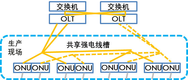 整體組網(wǎng)采用OLT主備端口1+1保護,網(wǎng)絡(luò)故障支持50ms快速倒換,滿足生產(chǎn)線高可靠性的網(wǎng)絡(luò)訴求。