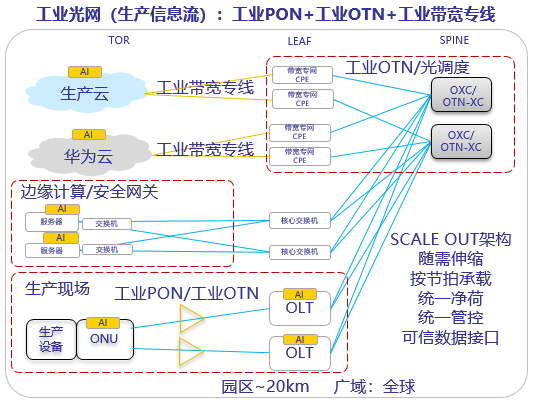 工業(yè)光網(wǎng)整體上是一個類數(shù)據(jù)中心網(wǎng)絡(luò)的SPINE/LEAF架構(gòu),例如在上圖的架構(gòu)中,生產(chǎn)現(xiàn)場網(wǎng)絡(luò)的OLT、帶寬專網(wǎng)的CPE等設(shè)備作為LEAF節(jié)點,而OXC/OTN-XC等設(shè)備作為SPINE節(jié)點。SPINE/LEAF等網(wǎng)絡(luò)節(jié)點共同組成SCALE OUT架構(gòu),支持按需、彈性的伸縮,能夠很好的匹配企業(yè)生產(chǎn)線靈活調(diào)整對網(wǎng)絡(luò)帶來的訴求。