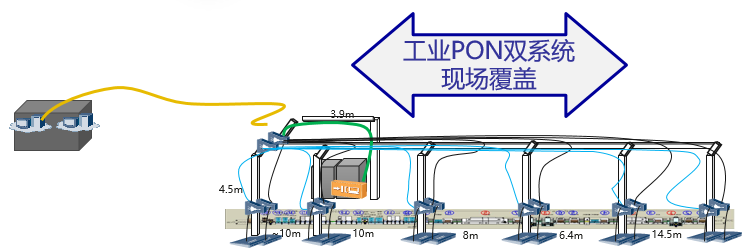 生產(chǎn)信息流網(wǎng)絡(luò)(工業(yè)PON)采用2級分光,OLT到第一級分光器采用2:8分光,分光器部署在強電槽橋架內(nèi),OLT到分光器采用Type B保護,以提升網(wǎng)絡(luò)的可靠性。二級1:8分光,部署在對應(yīng)槽位的立柱上,86盒式ONU安裝在線槽的立柱上,整體施工部署如下: