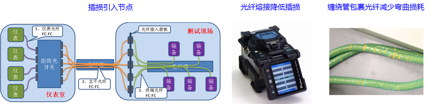 物理上光儀表集中在控溫控濕的儀表室,由專業(yè)人員統(tǒng)一管理維護及定期標定,以確保儀表處于正常工作狀態(tài)。對于光纖連接采用熔接/纏繞包裹/優(yōu)化FC連接器方式,將2km以內(nèi)的光纖連接損耗降到0.4dB以內(nèi),如圖2所示