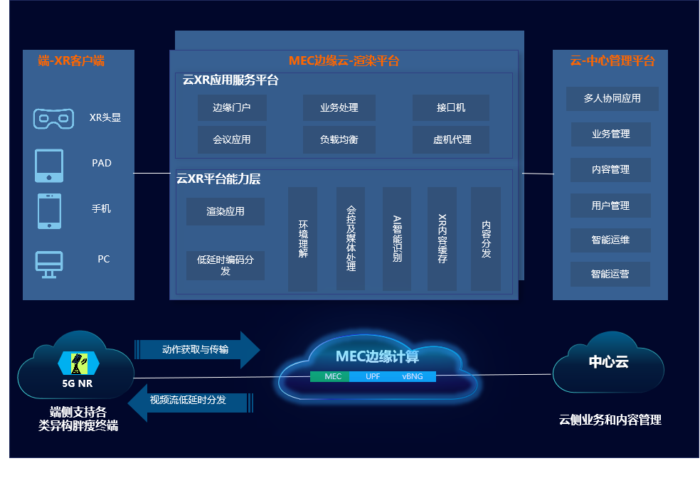 基于在5G、XR技術等方面的雄厚積累,中興通訊推出了以PAD/手機/VR和AR眼鏡客戶端、邊緣云XR渲染平臺和中心云管理平臺為主體的三級系統架構設計。系統具備故障弱化能力,在中心管理平臺不可用的情況下,保證現有的邊緣服務不中斷。系統利用邊緣云XR渲染平臺計算能力,釋放終端壓力,保證XR順暢運行,改善體驗。