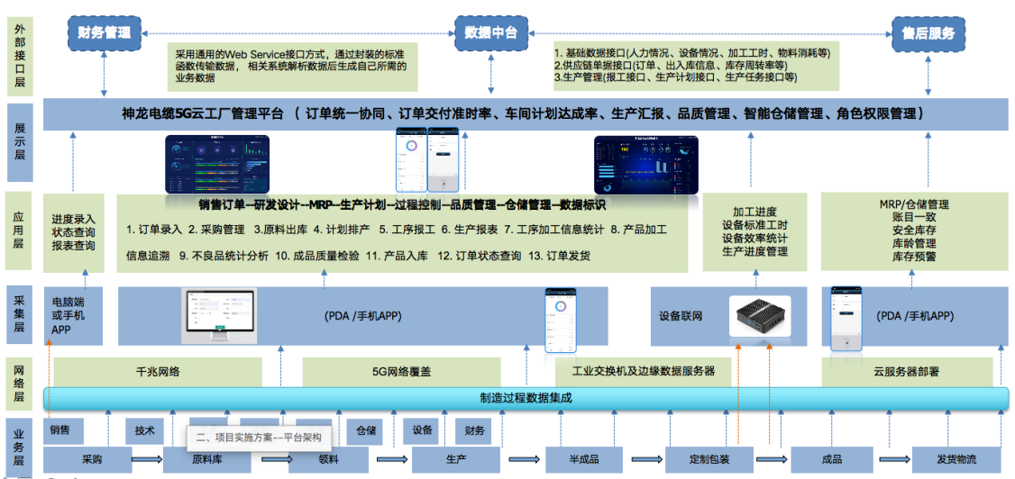 神龍電纜5G云工廠項(xiàng)目建設(shè)總體架構(gòu)主要分為:業(yè)務(wù)層、網(wǎng)絡(luò)層、數(shù)采層、應(yīng)用層、展示層與邊緣層。