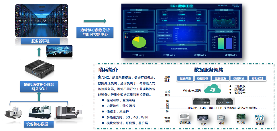 應(yīng)用5G網(wǎng)絡(luò)將設(shè)備聯(lián)網(wǎng),通過(guò)5G邊緣數(shù)據(jù)處理器哨兵NO.1對(duì)設(shè)備進(jìn)行加工參數(shù)、設(shè)備狀態(tài)等實(shí)時(shí)數(shù)據(jù)的采集,可實(shí)現(xiàn)對(duì)不同行業(yè)工業(yè)現(xiàn)場(chǎng)的智能設(shè)備進(jìn)行集中數(shù)據(jù)采集和監(jiān)控管理。另一方面基于5G邊緣數(shù)據(jù)處理器哨兵NO.1的內(nèi)置高性能芯片與處理系統(tǒng),能夠?qū)?shù)據(jù)從邊緣側(cè)、傳輸?shù)皆贫耍瑢?shí)現(xiàn)數(shù)據(jù)的遠(yuǎn)程接入。