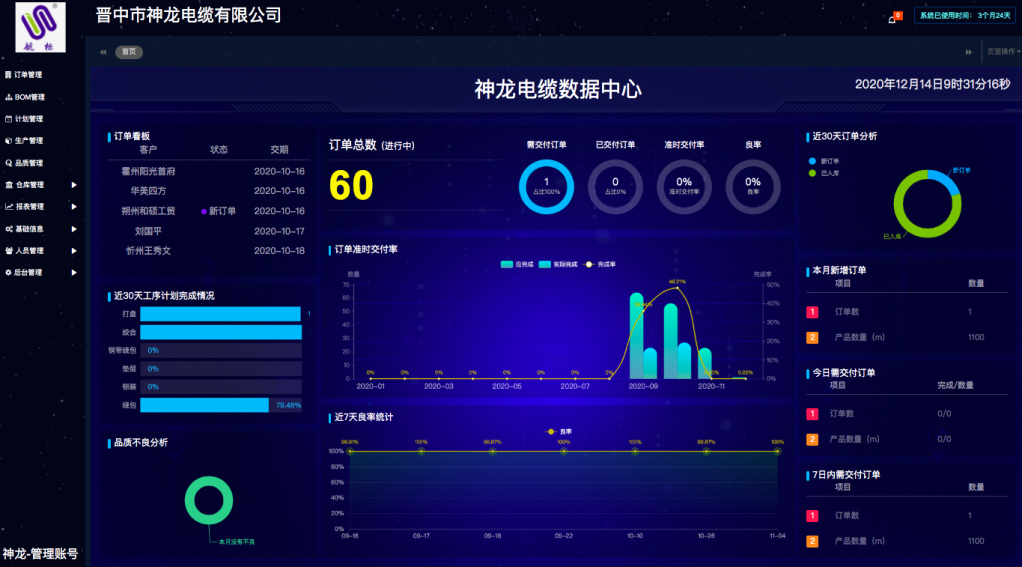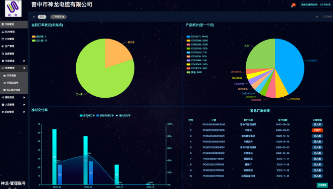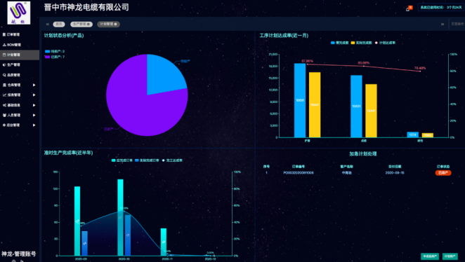 隨著神龍電纜企業(yè)規(guī)模的擴(kuò)大,公司業(yè)務(wù)快速成長(zhǎng),訂單數(shù)量逐年成倍增長(zhǎng),靠原有的生產(chǎn)管理模式已無(wú)法滿足企業(yè)發(fā)展的需要。面臨的主要問(wèn)題是訂單種類多,客戶下單頻度高,無(wú)法及時(shí)掌握訂單交付進(jìn)度,產(chǎn)品生產(chǎn)周期長(zhǎng),內(nèi)部生產(chǎn)計(jì)劃組織混亂,生產(chǎn)協(xié)同性差,重點(diǎn)設(shè)備管理混亂,無(wú)法監(jiān)控設(shè)備生產(chǎn)狀態(tài),導(dǎo)致產(chǎn)能不足,資源整體利用率低,同時(shí)隨著電線電纜的定制化程度增加,生產(chǎn)與精密加工對(duì)企業(yè)的協(xié)同設(shè)計(jì)、協(xié)同生產(chǎn)、協(xié)同供應(yīng)鏈提出了更高的要求,大量的技術(shù)工藝、原料檢測(cè)、生產(chǎn)協(xié)同、生產(chǎn)加工數(shù)據(jù)需要記錄、分析、反饋、決策。