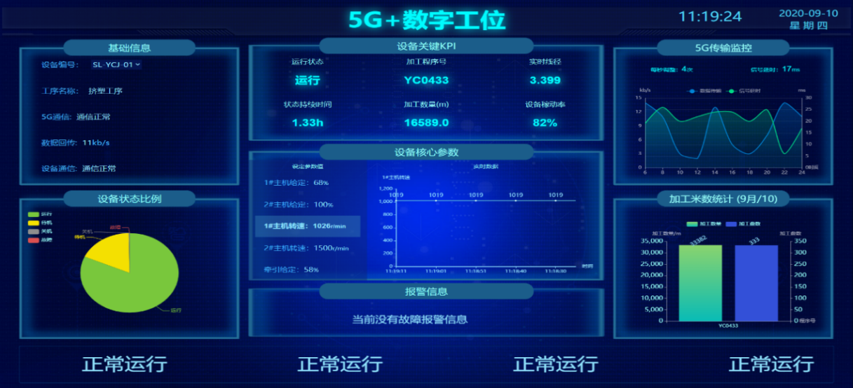 基于神龍電纜5G云工廠管理平臺(tái),建立由業(yè)務(wù)接單-研發(fā)設(shè)計(jì)-MRP-生產(chǎn)計(jì)劃-過(guò)程控制-品質(zhì)管理-倉(cāng)儲(chǔ)管理-物流發(fā)運(yùn)的完整管理協(xié)同平臺(tái);應(yīng)用5G技術(shù)實(shí)現(xiàn)車間內(nèi)部網(wǎng)絡(luò)重建;利用5G靈敏度傳輸,實(shí)現(xiàn)設(shè)備核心參數(shù)波動(dòng)的及時(shí)反饋,利用5G低延時(shí)技術(shù)實(shí)現(xiàn)數(shù)據(jù)與服務(wù)器的快速調(diào)取,并將波動(dòng)數(shù)據(jù)快速調(diào)整到標(biāo)準(zhǔn)值域,提高設(shè)備穩(wěn)定性。同時(shí)建設(shè)了邊緣數(shù)據(jù)處理中心,為日后設(shè)備接入預(yù)留了充足數(shù)據(jù)接口。