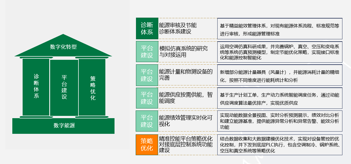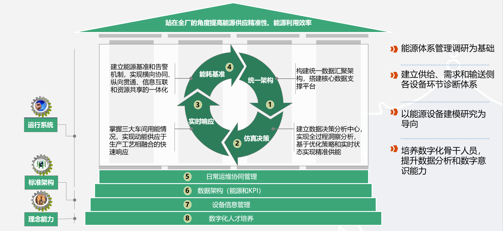 本項目旨在站在全廠的角度提高能源供應精準性、能源利用效率,能源體系管理調研為基礎,建立供給、需求和輸送側各設備環節診斷體系,以能源設備建模研究為導向,培養數字化骨干人員,提升數據分析和數字意識能力。