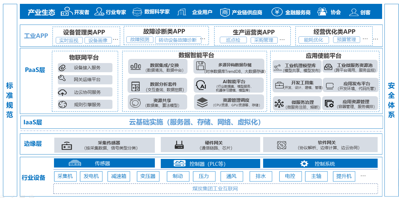 山西焦煤集團工業互聯網平臺提供從邊緣層各類設備數據的接入到數據轉發和工業大數據統一管理的完整解決方案。平臺自下而上共分為行業設備層、邊緣層、IaaS層、PaaS層和工業APP層等五個層面。為企業各領域提供診斷、預測和優化等智能化服務,通過數據分析和工業機理相結合,從而實現對復雜工業數據的深度挖掘,為企業提供決策優化。