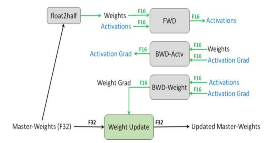 在訓練過程中,綜合考慮模型的訓練速度和精度,如果使用全精度模型,會導致訓練速度慢、顯存占用高等問題,但是使用半精度模型,會大大降低模型精度,因此在訓練過程中思謀使用了半精度和全精度結合的混合精度方案,即大部分模型使用半精度,但是對于一些敏感的部分使用全精度,這種兩種精度相結合的混合精度訓練方式,可以將速度和精度的平衡達到最優。在系統部署時,思謀全部使用了半精度模型,來達到最快的運行速度,并且相比較與之前的混合精度模型,不會有精度損失。算法精度方案如圖4所示。