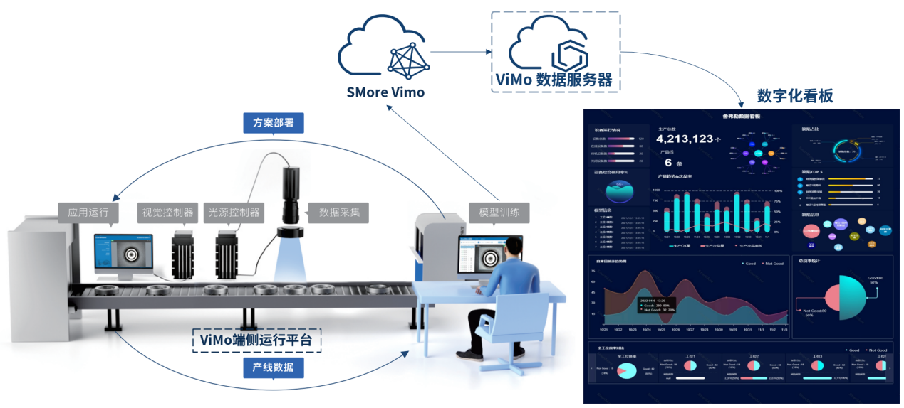 產線設備在生產過程種通過Vimo應用程序,配合現場的相機、光源、PLC等對實時生產的產品進行質量檢測,檢測的相關數據(圖片、檢測結果、缺陷類型等)上傳到SMore Vimo,進行AI模型訓練,處理后的數據通過ViMo數據服務器進行數字化看板展示。基于不同的缺陷,思謀的AI技術進行數據獨立存儲管理,一方面可以更有效的真的某種缺陷進行數字增量強化,又可以更好的為管理層提供高效的管理決策依據,優化生產。