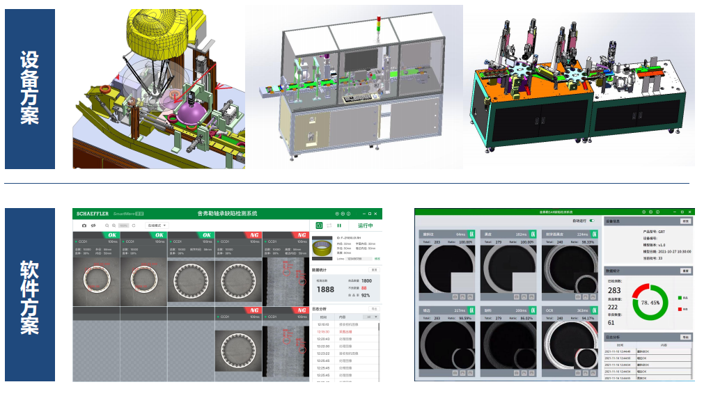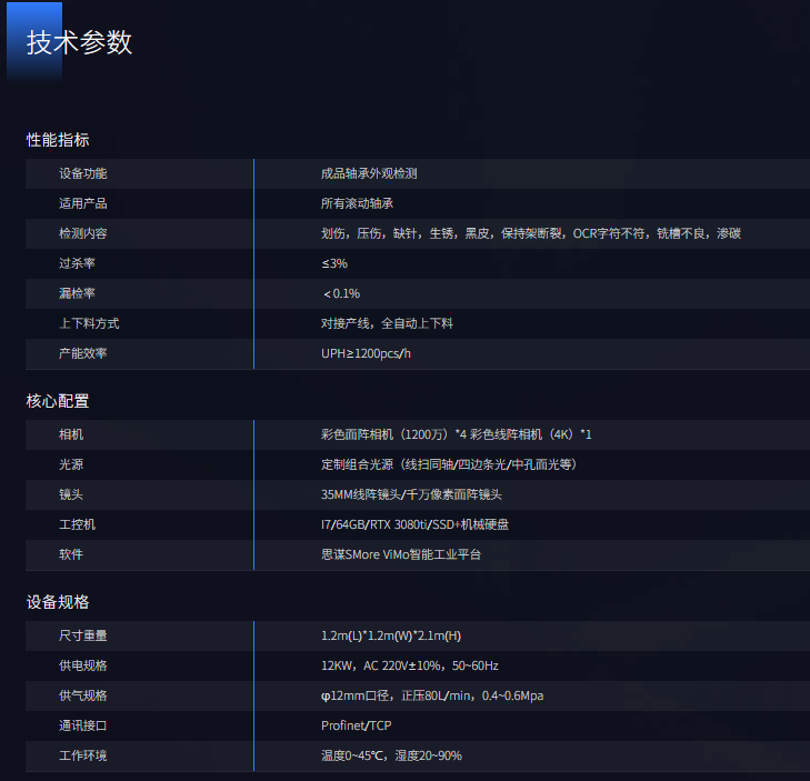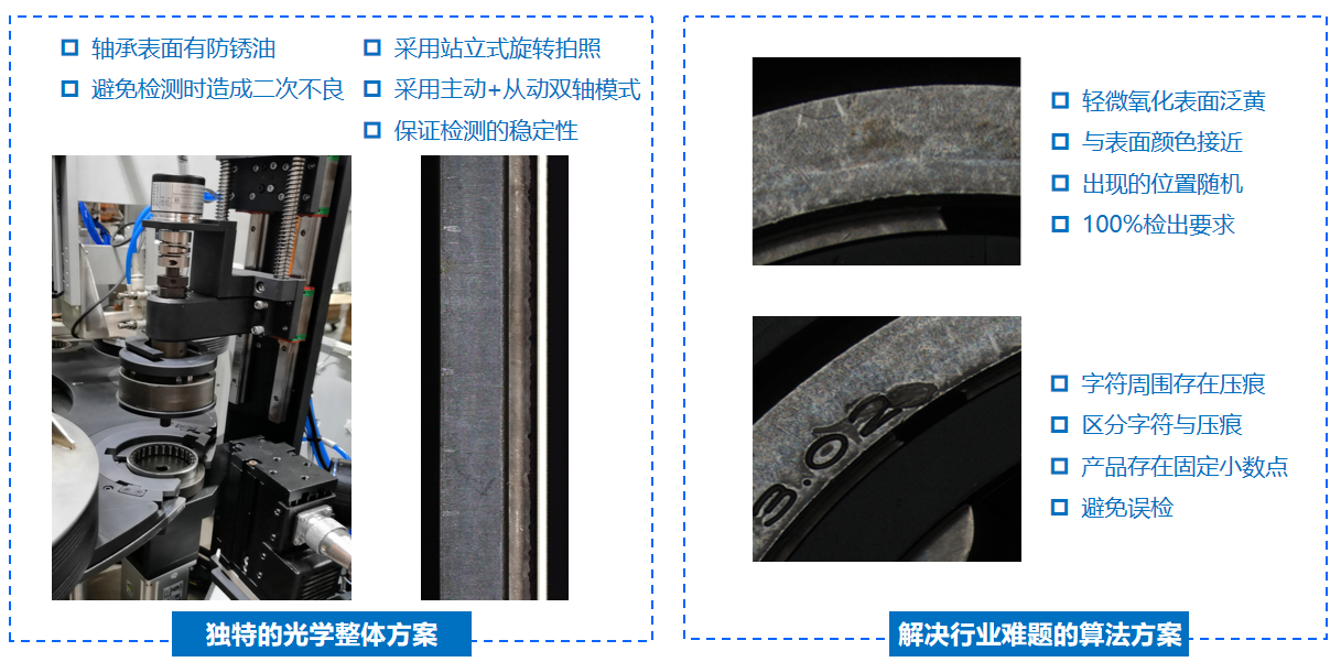攻克了兩大行業難題——對生銹缺陷的精準識別,以及對臟污、壓傷缺陷的精準區分,實現了視覺技術在軸承檢測應用的新突破。方案兼容超過20種產品型號,可一次識別23種缺陷,檢出≥99.59%,過檢率≤5%,檢測水平領先行業。(2)實現百分百人力替代