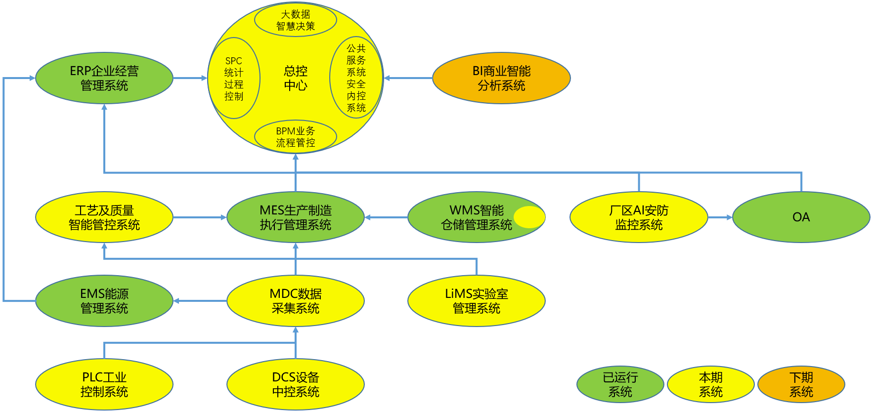 在現(xiàn)有ERP、MES、WMS、EMS、OA等信息系統(tǒng)的基礎之上,本項目實現(xiàn)了MDC數(shù)據(jù)采集系統(tǒng)、LiMS實驗室管理系統(tǒng)、廠區(qū)AI安防監(jiān)控系統(tǒng)、工藝及質(zhì)量智能管控系統(tǒng)、AGV調(diào)度系統(tǒng)等。后期規(guī)劃有BI商業(yè)智能分析系統(tǒng)。