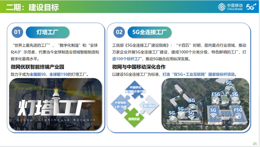 在此背景下,微網優聯作為“5G+工業互聯網”的受益者和推廣者,積極探索智能制造版圖,充分吸收一期5G智慧工廠的改造經驗,以打造“5G全連接工廠”“全球燈塔工廠”為目標,建設二期項目。二期項目規劃“5G+F5G”雙5G技術和數字化生產應用場景,結合制造業研發設計和生產工序,最大限度提升生產效率和利潤率,打造數字經濟與實體經濟融合新標桿。