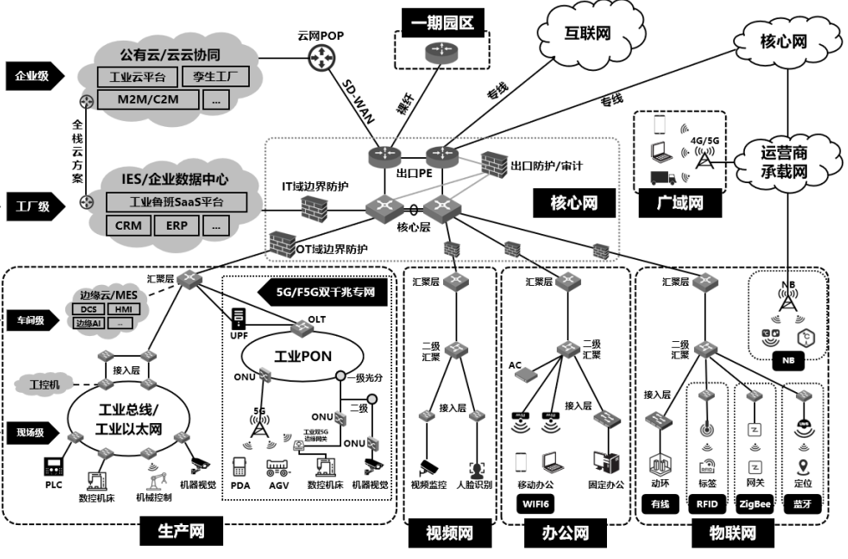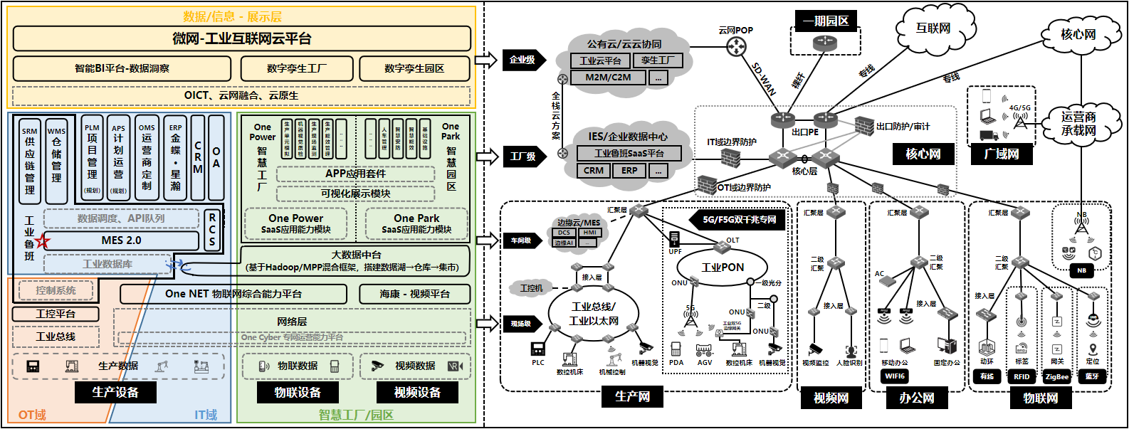 通過“5G尊享專網+工業PON+全棧云+多網融合、多云協同、云網統管”的綜合解決方案,將生產網(工業總線+工業以太網/工業全光網+工業無線網/5G尊享專網)、辦公網(有線/WiFi6)、視頻網(PON)、物聯網(NB/UWB/ZigBee)、企業核心網(集群、堆疊、v4/v6雙棧)和邊緣云(車間級MEC)、企業大數據中心(私有云)、工業SaaS云平臺(公有云)有機結合起來,通過云管(OpneStack)和網管平臺(OneCyber)將計算資源、存儲資源和網絡資源進行集成,構建OICT工業基礎設施助力企業數字化轉型。