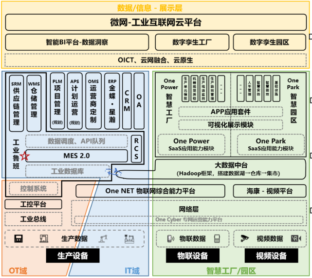 通過移動9 One平臺與微網工業魯班SaaS平臺相互融合,結合微網優聯二期“一條流”生產線上關鍵工序,聯合開展“工業雙5G應用、工業大數據中臺和工業AI、數字孿生智能制造”等關鍵技術/系統/場景的研究及創新應用。通過One NET物聯網綜合能力平臺實現了OT域與IT與的橫向打通,通過工業大數據中臺實現了數據的共享和利用,提高生產效率和管理水平。并且通過Paas層的數據基座建設,促進企業數字化轉型和創新,不斷拓展智慧工廠、智慧園區的應用場景,打造“云×5G/F5G+工業互聯網”領域的最佳實踐。