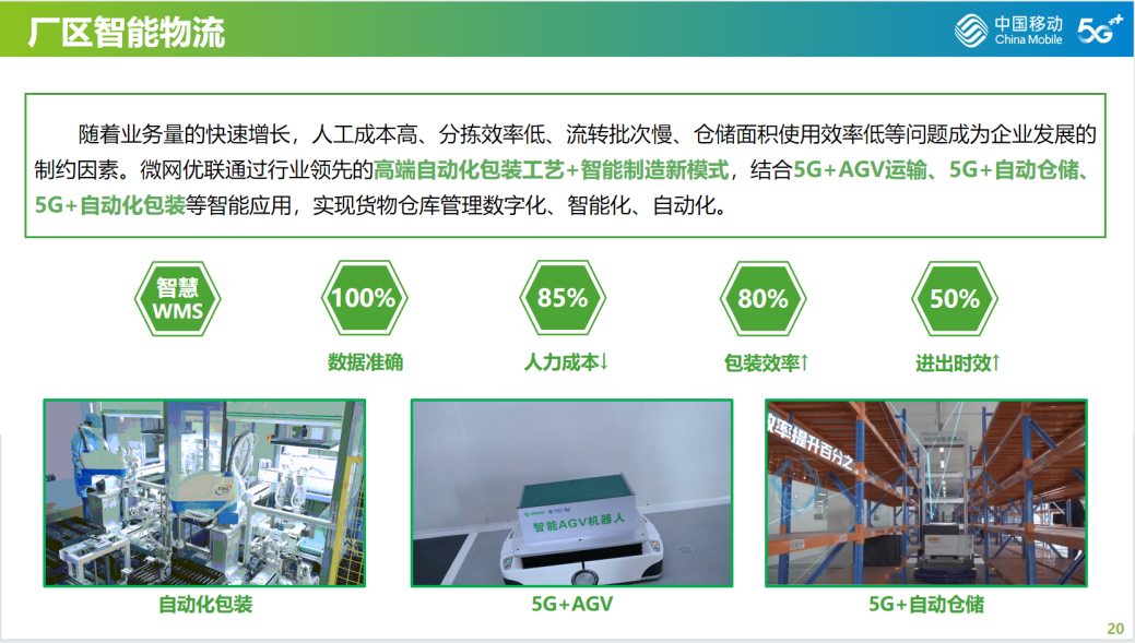 智能無人倉儲:通過物聯網、云計算和機電一體化等技術共同實現智慧物流,降低倉儲成本、提升運營效率、提升倉儲管理能力。通過5G+AGV、5G+AMR、5G無人叉車、無人倉視覺系統、智能物流調度系統等,結合室內高精定位技術(衛星、室分、藍牙等),實現物流終端控制、物料入庫存儲、搬運、分揀等作業全流程自動化、智能化。