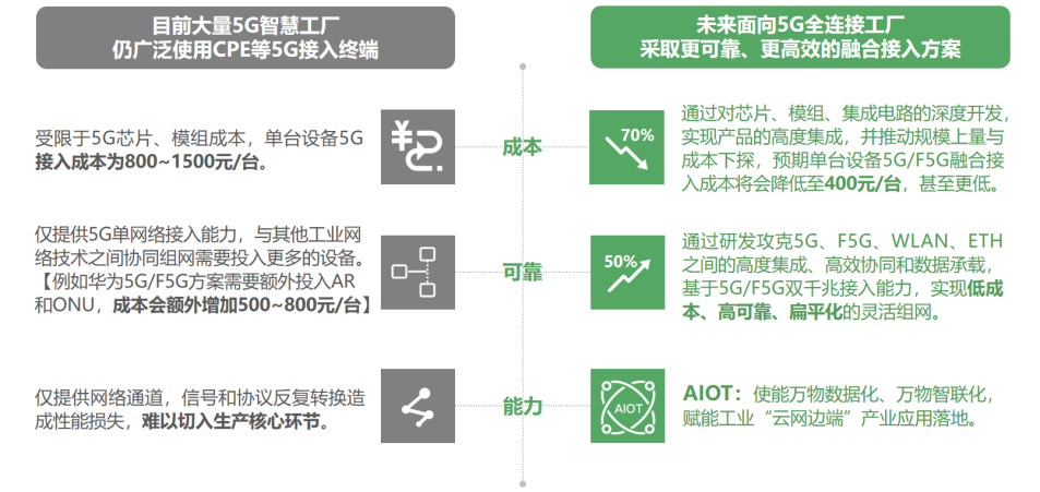 5G工業專網具備高帶寬、低時延、靈活接入的特點,F5G全光工業網具備架構簡單、穩定可靠、靈活調整的特點。通過工業雙5G智能邊緣接入網關,可以實現5G/F5G雙千兆網絡互補,為產線設備、高清視頻、IoT信號等數據回傳提供靈活的“有線+無線”高可靠網絡承載方案(生產設備固定時PON網絡即插即用、穩定傳輸、雙鏈路冗余備份,需要移動生產設備、柔性生產時斷掉PON也能通過5G網絡保證生產數據不斷線),讓傳統行業應用得以信息化升級換代,可以廣泛應用與智慧工廠、智慧園區、智慧學校、智慧醫療等行業應用場景。