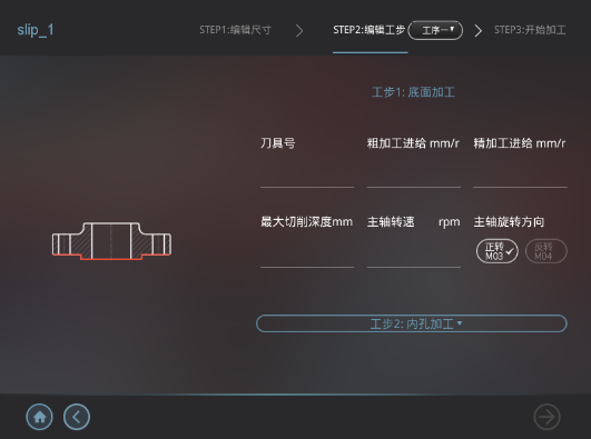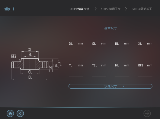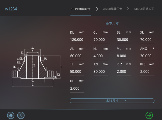 在新建程序模塊可以新建法蘭程序用于生產(chǎn)加工。首先,通過(guò)圖形化引導(dǎo)界面選擇法蘭類型,后根據(jù)需要選擇相應(yīng)加工工步,補(bǔ)充填寫(xiě)工件尺寸、工藝參數(shù)等信息,一鍵生成可執(zhí)行程序,最后可直接運(yùn)行加工程序,進(jìn)行加工。