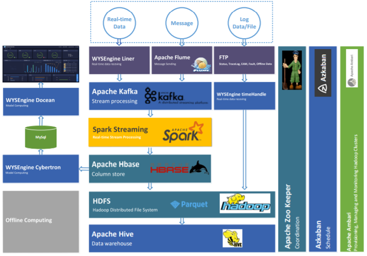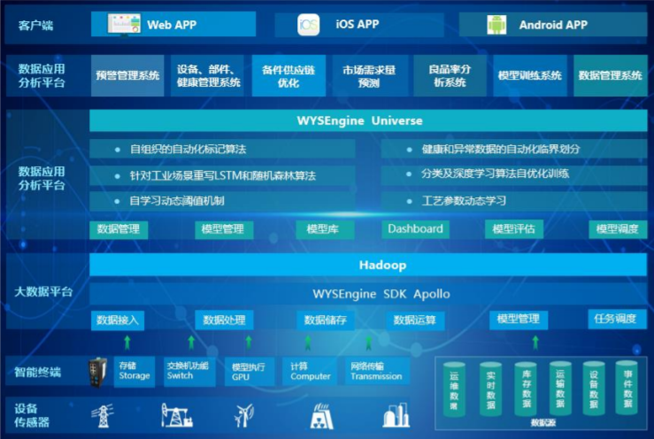 智能終端做為智擎工業(yè)設(shè)備數(shù)據(jù)采集運(yùn)算終端,可以與設(shè)備PLC 通信,把傳感器的實(shí)時(shí)數(shù)據(jù),錄波數(shù)據(jù)采集出來(lái),并且作為端的運(yùn)算終端,針對(duì)實(shí)時(shí)的數(shù)據(jù)進(jìn)行初步的運(yùn)算,然后進(jìn)行大數(shù)據(jù)平臺(tái)的數(shù)據(jù)接入,可以支持?jǐn)?shù)據(jù)的斷點(diǎn)續(xù)傳。WYSEngine SDK Apollo 作為產(chǎn)品數(shù)據(jù)接口的 SDK 組件,運(yùn)行與 Hadoop 大數(shù)據(jù)平臺(tái)執(zhí)行,按照工業(yè)設(shè)備的數(shù)據(jù)應(yīng)用場(chǎng)景進(jìn)行功能組件的封裝,實(shí)現(xiàn)從數(shù)據(jù)的接入、數(shù)據(jù)處理、數(shù)據(jù)存儲(chǔ)、數(shù)據(jù)運(yùn)算、模型管理和任務(wù)調(diào)度等功能,為上層應(yīng)用提供平臺(tái)級(jí)的支撐。