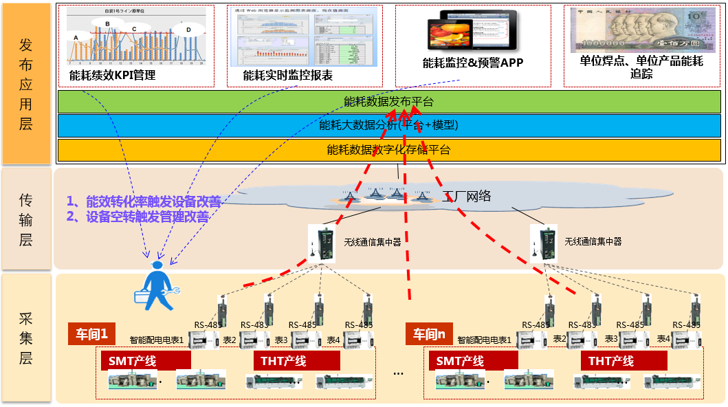 本APP采用工業互聯網技術,對生產設備用電參數及產出進行實時采集并通過自組網無線網絡將采集數據上傳至數據中心進行數據處理。通過自主開發的能耗預警邏輯,實現耗能超標設備自動預警、智能閉環;實現廠房、車間、線體、設備的四級能耗實時監控、單位能耗/絕對耗能超標預警及可視化管理。