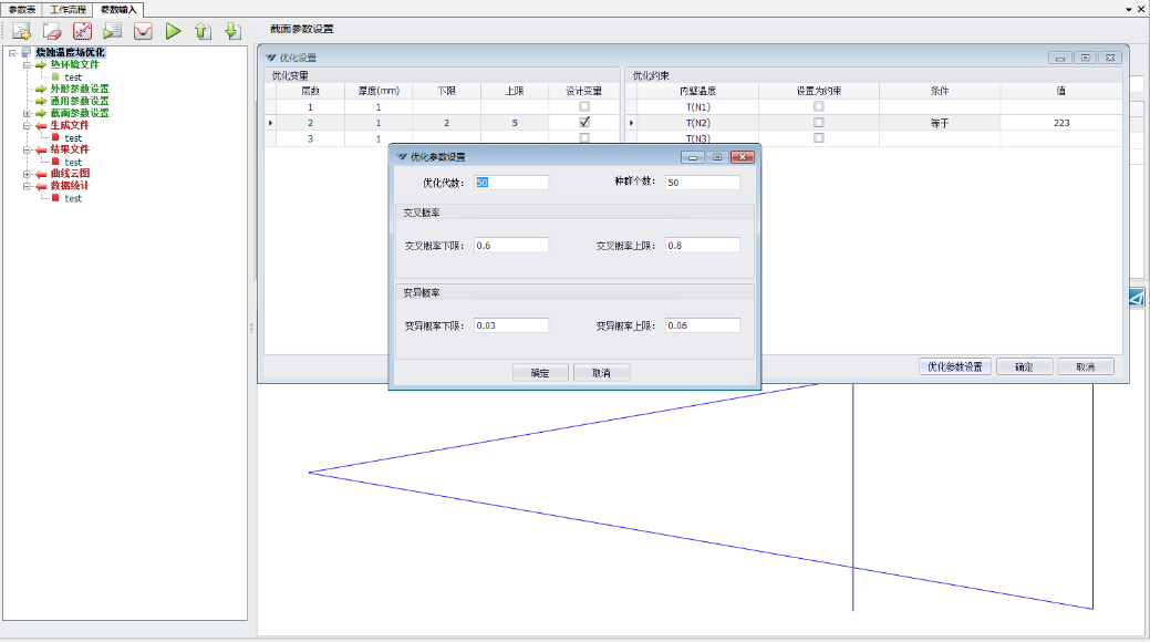 軟件嵌入多維(≥5維)優(yōu)化算法,可設(shè)置的優(yōu)化目標和約束條件,進行設(shè)計變量的優(yōu)化設(shè)計。