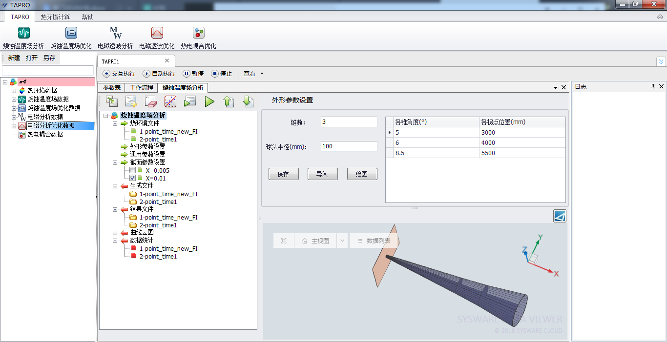 TAPRO智能化燒蝕溫度計算分析軟件基于基于“SYSWARE工程中間件平臺”開發(fā),主要包括執(zhí)行控制、功能模塊和數(shù)據(jù)管理三大部分。其中功能模塊用包含五種計算分析功能,如下圖所示。用于實現(xiàn)前處理和后處理功能。