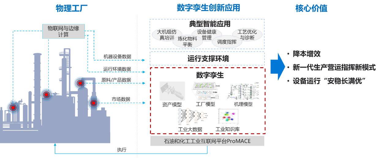 基于數(shù)字孿生的工業(yè)互聯(lián)網(wǎng)應(yīng)用,融合了十多年石化行業(yè)經(jīng)驗(yàn)與認(rèn)知,將數(shù)字孿生技術(shù)沉淀于工業(yè)互聯(lián)網(wǎng)平臺,通過構(gòu)建以資產(chǎn)模型、工廠模型、機(jī)理模型、工業(yè)大數(shù)據(jù)模型、工業(yè)專家知識庫為核心的數(shù)字孿生體,支撐典型智能應(yīng)用,為石油和化工行業(yè)的數(shù)字化轉(zhuǎn)型發(fā)展提供新動能。