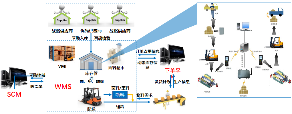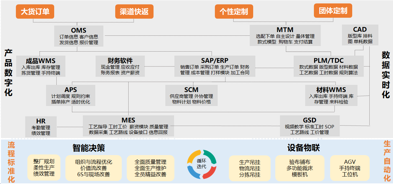 海思堡項目通過產品數字化及數據實時化,通過OMS定制下單系統,輔助AI量體,實現用戶個性化定制下單,由TDC技術數據中心實現工藝、版型等的自動處理,并通過CAD實現版型生成。SCM與WMS系統,實現供應商高效協同與物料精準管理,由APS高效排產,MES信息化驅動裁剪、縫制、后整、包裝全生產過程,成品WMS及TMS對接,實現成品的高效管理及實時追蹤。基于上述的全流程信息化方案,同時,對接鋪布、視覺檢測、裁剪、吊掛、AGV、分揀、亮燈、手持機等自動化設備和應用,實現大規模個性化定制的服裝智能制造解決方案。