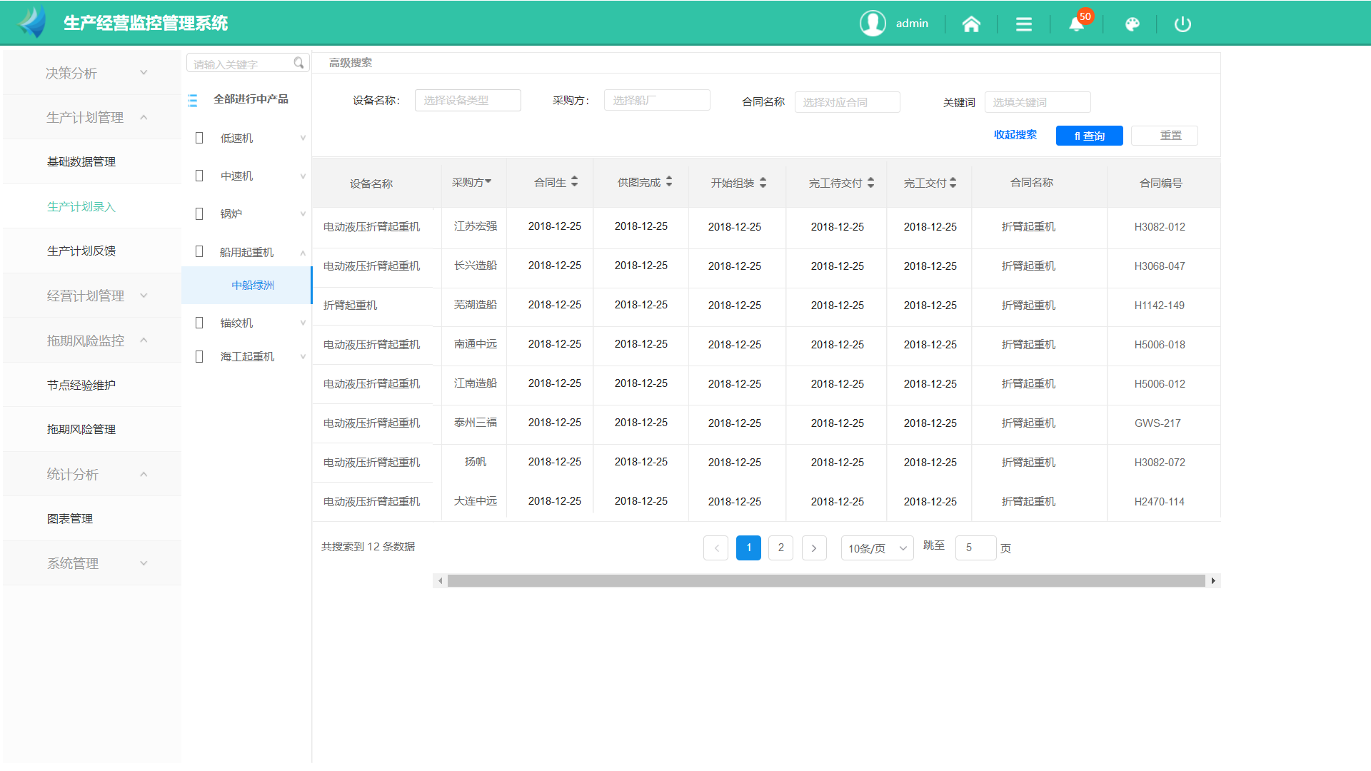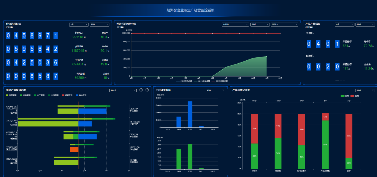 該模塊主要包括企業及其配套企業看板,企業看板中,展示配套企業的合同比例、總金額比例、訂單情況,生產狀態情況,拖期風險清單,拖期產品詳情(承接方、采購方、設備類型、當前節點、狀態),拖期比例,平均拖期天數。在非標件配套企業看板中,展示合同數量,合同總金額,月度、在跟蹤、手持訂單情況,外委非標件的生產狀態詳情,拖期風險清單,拖期詳情等核心信息。