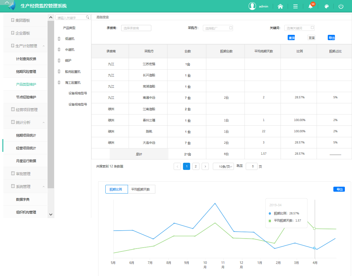 脫期項目統計主要基于產品類型、配套企業、采購方以及關鍵詞等,對脫期項目進行篩選統計,呈現脫期臺數、脫期天數、脫期比例、脫期占比等統計表格,并形成趨勢圖。拖期項目統計功能示意如下圖所示: