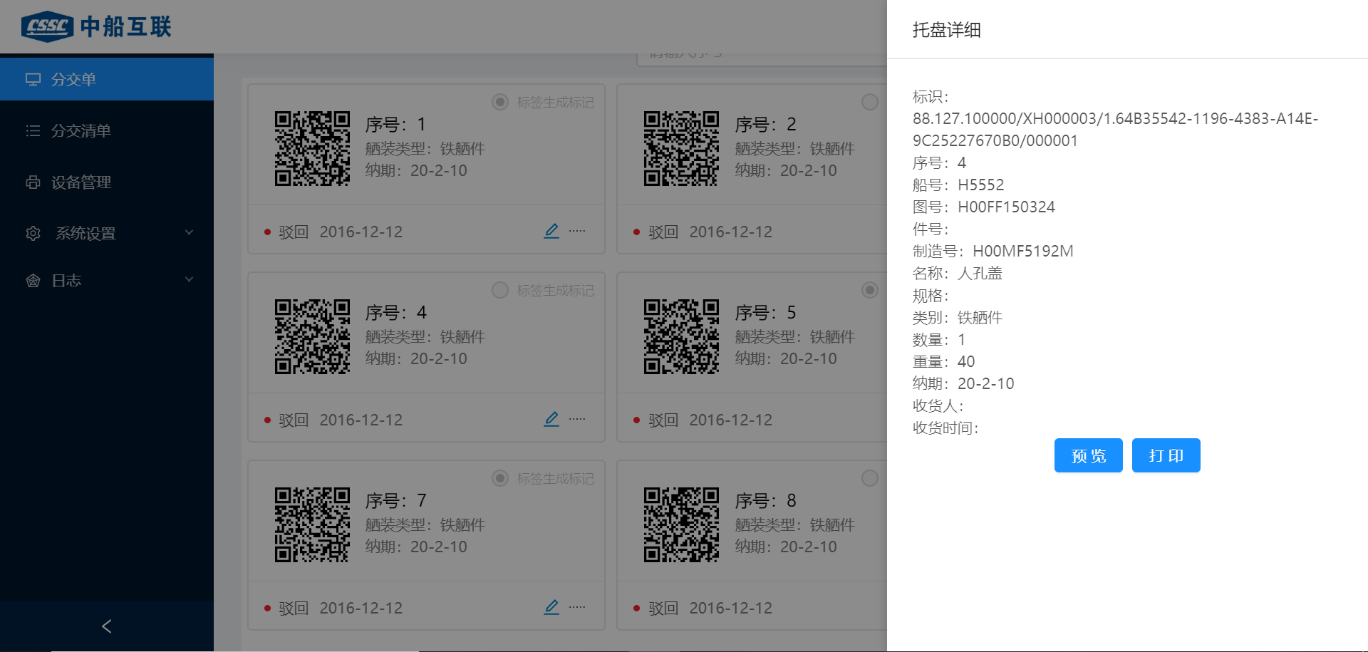 非標件成品賦碼模塊結合工業互聯網標識解析二級節點,獲取在制非標件編碼、屬性、圖紙等信息,并且通過與打印機、掃描設備等賦碼和標識識別設備集成,實現標識的快速打印,同時通過打印信息與生產制造信息的集成,實現配套企業生產制造狀態的實時在線反饋。其系統界面如下圖所示: