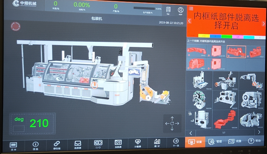 ZB415煙機產線由主機加輔機組成,體積龐大。該智能機組內置超過400個采集點位,每個點位的數據采集頻率均為毫秒級。因此系統(tǒng)每秒會產生海量的數據,要將這些數據實時的傳輸到數字孿生系統(tǒng)中就需要5G網絡大帶寬的加持,通過數字孿生系統(tǒng)對機組的運行狀態(tài)進行遠程的控制,如開機、停機、復位、包裝速度調整等。5G網絡的低時延、高可靠性確保了這些控制指令下發(fā)的實時性和可靠性。當機組某一個零部件出現故障時,數字孿生系統(tǒng)會通過布置在機組內部的傳感器檢測到該零件,并立即在系統(tǒng)內進行報警;同時會聯動監(jiān)控攝像頭定位到出現故障的零部件的位置,并放大監(jiān)控畫面以便于控制中心的專家進行進一步的故障診斷和確認。