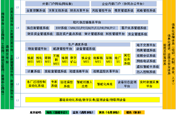 主要技術舉措(各層架構技術模式、種類) | 1.基礎設施層面 酒鋼數據中心布局分為主機房區、支持區及輔助區。主機房區放置服務器機柜、網絡機柜、專用空調設備、列頭配電設備。支持區包括UPS配電間、電池間、鋼瓶間,用于布置機房輔助基礎設施。輔助區為值班監控大廳和運營辦公室。 酒鋼數據中心基礎設施分為供配電系統、空調與通風系統、消防系統、防雷接地、安防門禁及監控系統、門禁系統、綜合布線系統等。機房的供配電系統為雙路電源互投切換+UPS并機冗余+輸出雙回路的高可靠性的供電方式。空調與通風系統由新風機、3+1空調及排煙風機組成。主機房及UPS配電間采用火災自動報警系統及管網式七氟丙烷氣體滅火系統進行保護,滅火氣體鋼瓶集中放置于鋼瓶間內。安防門禁及監控系統由視頻監控系統、指紋識別門禁系統及動環監控系統構成。綜合布線系統采用機柜上走線方式,吊裝開放式線槽布線。 2.IT層面(服務器網絡) (1) 網絡架構 基于園區網一張物理網絡,按照工業業務需求已承載53張邏輯網絡。 (2) IT架構 目前采用工業私有云架構,底層將計算、存儲、網絡資源進行虛擬池化,上層搭建云門戶,建立服務目錄和自助服務流程,按照用戶需求,實現自動化部署和安全防護。 3.應用層面 酒鋼十四五規劃的工業應用系統總體架構圖如下: |