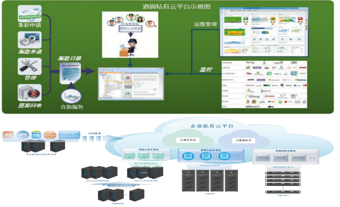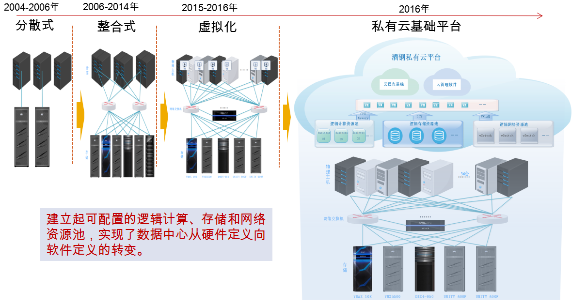 傳統工業模式與改造后新模式的對比描述 | 酒鋼信息中心依據云計算技術架構和發展趨勢,結合酒鋼實際情況,搭建完成甘肅省首家工業私有云平臺,使得酒鋼數據中心真正從傳統數據中心轉型升級到綠色節能云數據中心。 酒鋼從傳統數據中心向云數據中心的發展演變圖如下: 工業私有云的實現是傳統IT架構的跨越式創新,是酒鋼數據中心向云數據中心轉變的關鍵,較傳統IT架構,其優勢如下: 1.計算資源利用率提升10倍:以前一臺服務器上只運行一個應用,資源占用基本在20%-30%,現在一臺服務器上運行10-15個虛擬機和應用,資源占用在80%左右,大大降低設備的采購成本。 2.系統部署時間縮短2個月:以前實施一個信息化項目需要先采購服務器再進行業務系統部署,至少需要2個月時間,現在只需要幾小時到幾天時間即可,大大縮短系統上線時間; 3.提升系統的可靠性和可用性,系統可用率從2015年的98.56%提高到現在的99.95%,同時數據存儲在私有云平臺上的虛擬存儲雙活資源池中,較以前本地硬盤可靠性提升明顯; 4.利用高效的備份機制實現數據高效備份,數據備份效率提升2-4倍; 5.建立酒鋼私有云云服務門戶,用戶可以通過該門戶申請和管理私有云資源,完成了IT部門服務型轉型; 6.實現計算、存儲和網絡資源申請后的自動化部署,大大提升服務效率,減少人為干預; 7.配置安全組,制定安全策略標準,實現系統之間的安全防護,大大提升私有云平臺上的安全隔離,有效防止大規模病毒爆發的可能性; 8.實現私有云資源的監控和管理,同時資源警告和預警有效顯示,為故障排查提供了自動化手段。 |