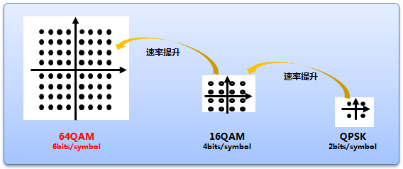 根據(jù)無線環(huán)境的質(zhì)量,eNodeB可以選擇不同階次的QAM調(diào)制方案。如果UE離eNodeB非常近或是處在一個好的無線環(huán)境下,那么eNodeB能夠選擇最高階QAM調(diào)制(64QAM方式)和較大的傳輸塊進(jìn)行上行傳輸,從而實現(xiàn)更高的數(shù)據(jù)速率。