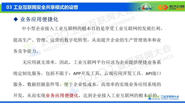 點擊以下鏈接查看演講視頻: 專家說 “中小企業接入工業互聯網的根本目的是享受工業互聯網的發展紅利,實現生產、管理、運營的數字化轉型,從而提升企業的生產管理效率和業務競爭能力。無應用就無效率,因此工業互聯網平臺應該為企業提供便捷業務定制化服務,包括不限于APP的開發工具、云端應用開發工具、API服務接口、數據挖掘套件等,便于企業低成本、高效率實現業務應用系統的開發,從而實現業務應用便捷化,達到企業接入工業互聯網的根本目的。” 以下是演講PPT 敬請閱讀