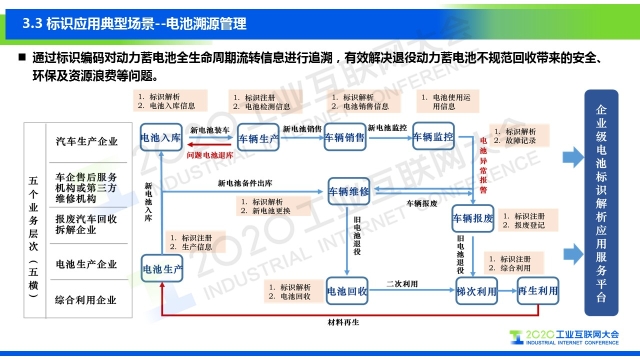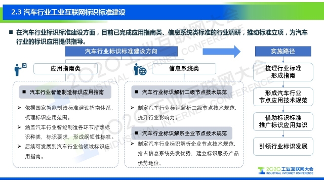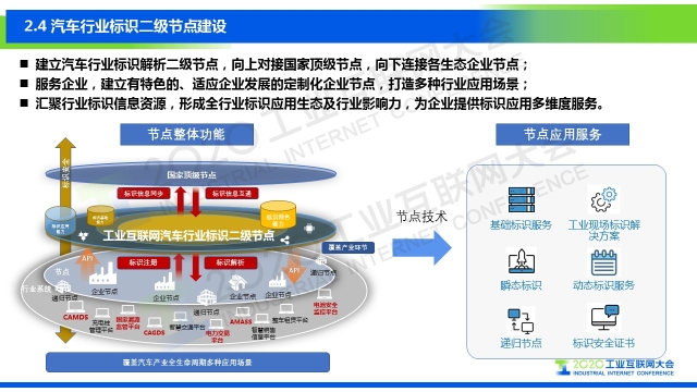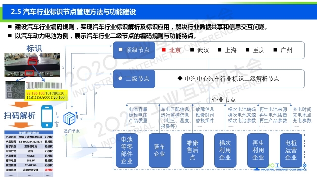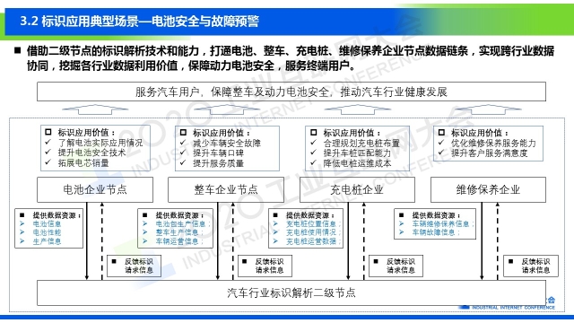 “標識解析在汽車領域的應用分別為運營大數據的動態標識管理(又稱“車聯網數據”)、電池的安全與故障預警、電池溯源管理、智能制造或者智慧工廠等四大場景。標識體系目前將重點開展兩個方面的標準:一是應用指南類標準,包括汽車行業智能制造標識應用指南、二級節點技術規范、企業節點技術規范等,均已處于立項階段;二是二級節點的建設,包括建立汽車行業的標識解析二級節點,對接國家頂級節點,連接各個企業的節點,同時節點建設要服務于企業,整合行業的相關資源,助力企業建立適合企業自身發展的定制化節點。”