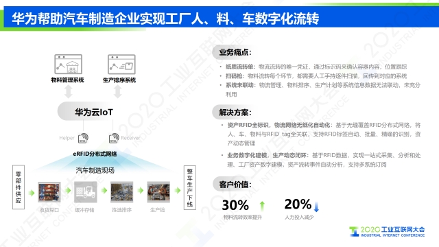 點擊下方鏈接,觀看演講視頻 專家說 “全要素連接,多域數(shù)據(jù)協(xié)同,是制造數(shù)字化轉(zhuǎn)型的基礎(chǔ)。華為云IoT工業(yè)互聯(lián)網(wǎng)解決方案提供生產(chǎn)要素的全連接,一站式的工業(yè)數(shù)據(jù)的治理和孿生分析,幫助制造業(yè)企業(yè)實現(xiàn)了生產(chǎn)現(xiàn)場制造KPF的優(yōu)化,質(zhì)量的全流程追溯和管控。我們提供創(chuàng)新的5G的RFID服務(wù),實現(xiàn)了倉儲的數(shù)字化、物料全程自動化跟蹤、商場計劃、物流管理、供應(yīng)管理需求動態(tài)協(xié)同,提升物料的流轉(zhuǎn)效率30%。當前,制造業(yè)數(shù)字化轉(zhuǎn)型正當時,華為愿與產(chǎn)業(yè)鏈上下游伙伴們攜手供應(yīng),共同構(gòu)建工業(yè)互聯(lián)網(wǎng)的黑土地。” 以下是演講PPT 敬請閱讀