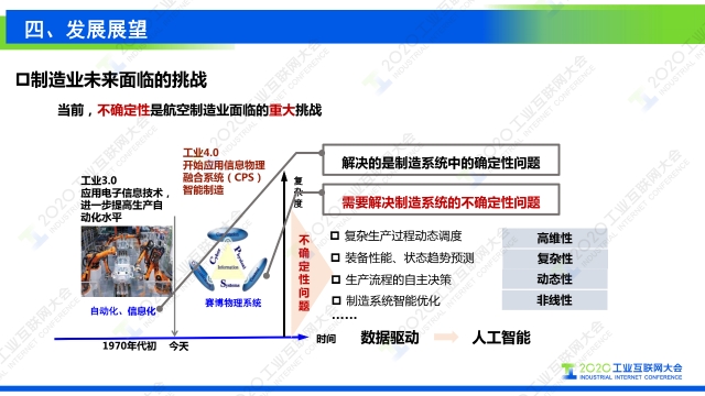 “不確定性是航空制造面臨的一個重大挑戰。工業3.0主要是實現自動化,解決的是制造系統中的確定性問題。工業4.0開始建設CAPP物理系統,也就是我們說的CPS系統,需要解決制造系統中的這么一個不確定性,例如復雜生產過程、動態調度,裝配性能狀態的趨勢預測,包括生產流程、工業流程的自主決策。整個智能制造系統智能化是非常重大的一個挑戰。為了解決未來航空制造中存在的不確定性問題,需要高校的把人工智能、工業大數據至少進行融合,高校低成本的獲取數據,并利用數據,通過數據利用不斷優化制造過程,驅動管理優化與變革。”
