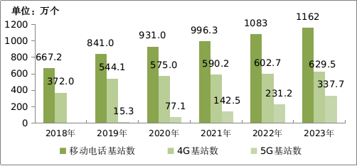 截至2023年底,全國移動通信基站總數(shù)達(dá)1162萬個,其中5G基站(注3)為337.7萬個,占移動基站總數(shù)的29.1%,占比較上年末提升7.8個百分點。