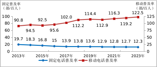圖2-1 2013—2023年固定電話及移動電話普及率發(fā)展情況