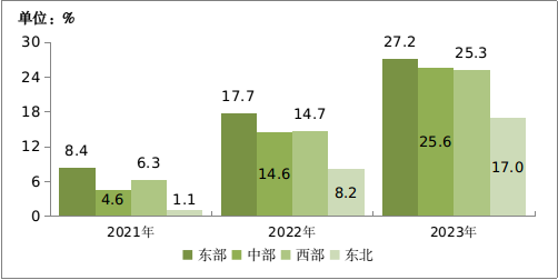 圖5-2 2021—2023年東、中、西、東北地區(qū)1000Mbps及以上速率固定寬帶接入用戶滲透率情況