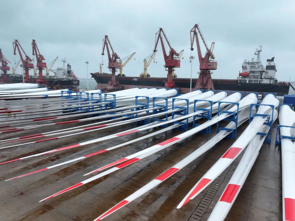 2025年10月13日,在江蘇省連云港港東方港務(wù)分公司碼頭,大批風(fēng)電設(shè)備集港準(zhǔn)備裝船出口國外(無人機(jī)照片)。新華社發(fā)(王春 攝)