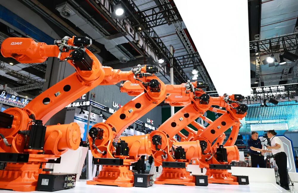 這是2025年9月23日在上海舉行的第25屆中國國際工業(yè)博覽會上拍攝的一組大型工業(yè)機(jī)器人產(chǎn)品。新華社記者 方喆 攝