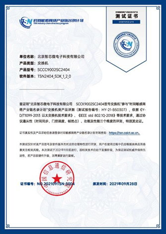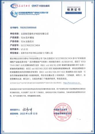 2021年9月,北京智芯微電子科技有限公司研發的TSN交換機在互聯網與工業融合創新工信部重點實驗室順利通過“TSN產業鏈名錄計劃”產品測試,獲得交換機類測試證書,成為第一批加入產業鏈名錄計劃的產品,2023年6月,同系列交換芯片也順利通過產品評測,獲得芯片模組類測試證書,成功加入TSN產業鏈名錄。